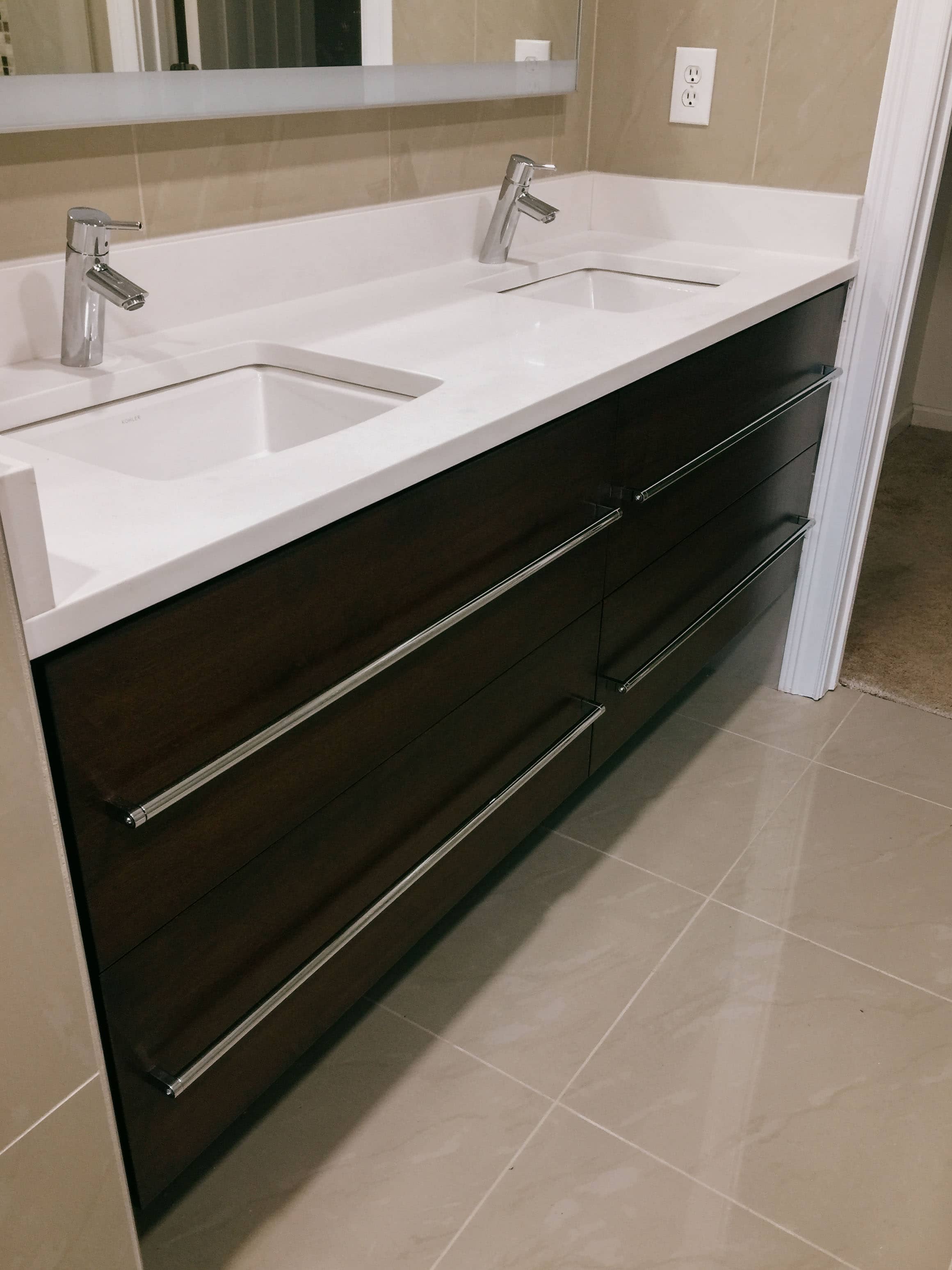 All surfaces are sanded smooth before primer, paint, stain, or clear coat is applied. We install knobs and pulls, then level and secure the vanity to your wall studs for a precision fit that looks like it was always meant to be there.